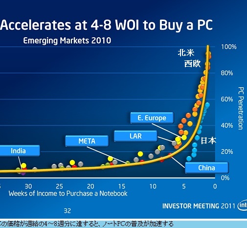 パソコンが安くなれば普及率が100%に迫る欧米に比べ、日本では60%を前に頭打ちになる――《元麻布春男の週刊PCホットライン〜低価格化が進まない日本のPC事情》で不思議な傾向が紹介されました。米インテル社の投資家ミーティングで公開されたグラフを、一部トリミングして以下に掲げます。その国のパソコン価格が週給の4〜8倍くらいまで下がるとノートPCの普及が加速する様子が描かれていて、100%に迫っている黄色が北米、オレンジが西欧、離れたブルーが日本です。