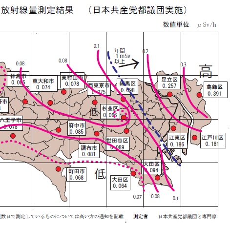 ほとんどの在京メディアが騒がないので共産党の貴重な提言「東京都内各地の空中放射線量測定結果について」を見落とすところでした。放射線障害防止法など国内法で決まっている一般人の年間被ばく限度線量1mSvを、東京23区の東半分では超える恐れがあるとの指摘で、特に資料Bの放射線量分布マップは必見です。