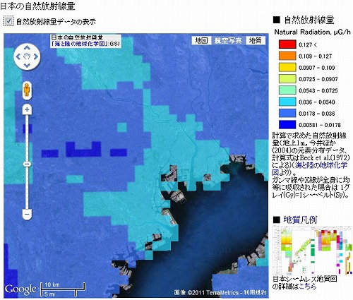 これに対して、日本地質学会の「日本の自然放射線量」から都内付近を取り出したのが以下です。