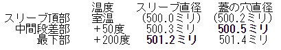 話の見通しを良くするために簡単なモデルを考えます。スリーブは段差がない直径500ミリ、建設時の蓋側の穴は片側0.1ミリのすき間があるとして500.2ミリ、中間段差部は最上部の室温より50度プラス、最下部の原子炉側は室温プラス200度とすれば、スリーブと蓋の穴の直径は鋼材の膨張を考えると現在、以下のようになっています。