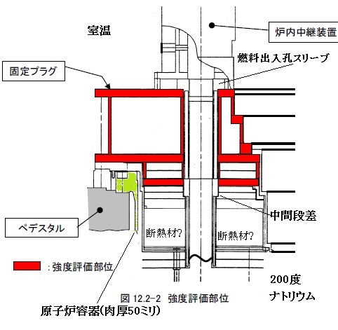 上の図は「図12.2-2強度評価部位」を加工したものです。固定プラグと呼ぶ原子炉上蓋にスリーブが組み込まれ、その中に炉内中継装置がはまっています。装置がスリーブにぶつかった際の衝撃を評価する図で、赤く塗られた鋼材骨格の太さと熱伝導性の良さを考えると、赤い部分はほぼ室温に近いと考えます。その下にスリーブの中間段差があり、蓋側の内部には断熱材と思われる層が幾重にも重なっています。スリーブは上部と下部に空洞を持つようです。