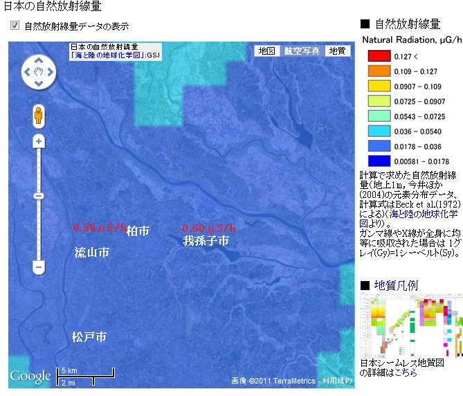 この地区の自然放射線量を知っていただくために、日本地質学会の「日本の自然放射線量」から地図を引用し、上の2地点の線量を書き込みました。