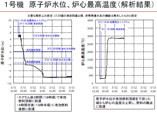 炉心溶融は1〜3号機いずれでも起きました。最も早かった1号機では以下のような解析になっています。地震・津波の当日午後6時過ぎには圧力容器の冷却水は干上がり、炉心は2800度の高温に達し溶融しました。