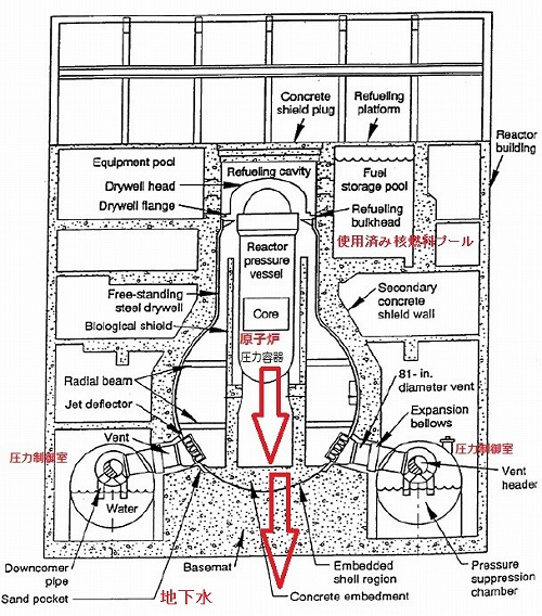 格納容器図にある上の矢印の通り溶融体は圧力容器から抜けて底に落ちました。水の原子炉注入が始まったのは翌日ですから、この時、溶融体を冷やせる水は格納容器底には無かったはずです。高温を維持していれば下の矢印のように突き破って行かざるを得ません。いま懸念されるのは地下水との接触です。
