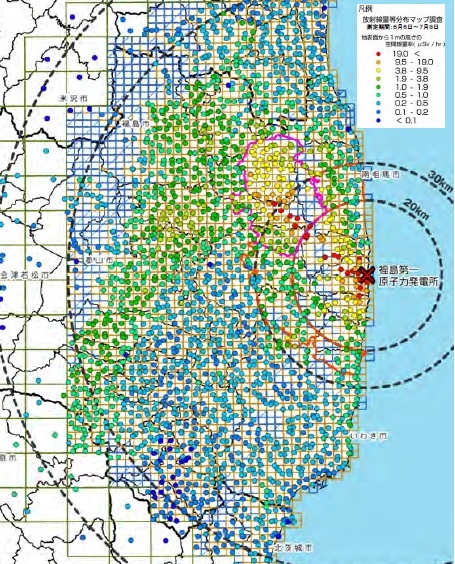 ピンクの線で仕切られた飯舘村など計画的避難区域は黄色の点で占められています。その直ぐ下、1.9〜3.8マイクロシーベルト毎時である黄緑色の点が都市部に広がり、1.0〜1.9マイクロシーベルト毎時の緑色が中通り東側を埋め尽くしています。この地区の自然放射線量はせいぜい0.054マイクロシーベルト毎時程度ですから、法定の年間限度線量1ミリシーベルトの10倍前後にもなる地域がこんなにも広大なのです。