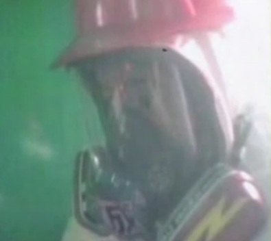 最後は作業している勝野氏の写真。作業員はお互いにこの姿ですから、声を掛けても通じず、能率良く進みません。2時間で1作業をして次の班と交替、2時間休んでまた作業ですから1日に4時間。5月の連休明けから7月上旬まで2カ月近く続けたそうです。なお、特殊な機械なので英国人講師から事前教習を受けています。