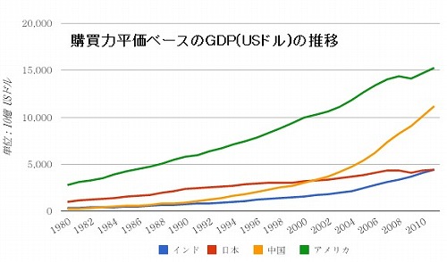 日経新聞の《インドGDP、購買力平価で日本抜き3位へ 現地紙報道》が「インド経済紙最大手エコノミック・タイムズは20日付の一面トップで、2011年のインドのGDP(国内総生産)が購買力平価(PPP)ベースで、日本を抜いて世界3位になる見通しだと報じた。同紙によると、10年のインドのGDPはPPPベースで4兆600億ドルで、米国、中国、日本(4兆3100億ドル)に次ぐ4位」と伝えました。「世界経済のネタ帳」を利用して、インドと日中米のGDP推移グラフを作ってみました。