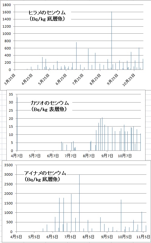福島沖を中心にした水産庁の「水産物の放射性物質調査の結果について」にあるエクセルデータを加工してみました。魚種別に分類し直し、公表日付順に並べました。事故直後からよく採取されている底魚のヒラメとアイナメ、それに表層を泳ぐカツオについてグラフにし以下に掲げます。