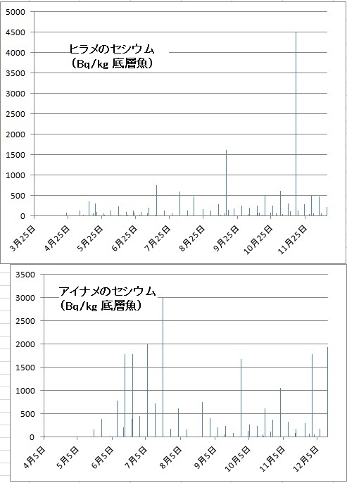 福島沖で採取された魚の1キロ当たりセシウム含有量は夏の終わりにかけて減少する傾向を見せていましたが、秋に入って反転、増加しています。特にヒラメは暫定基準の500ベクレル前後をたびたび示し、11月16日に4500ベクレルの最大ピークを記録しました。やはり底魚のアイナメも11月30日に1780ベクレル、12月14日に1940ベクレルと非常に大きな汚染値を出しています。