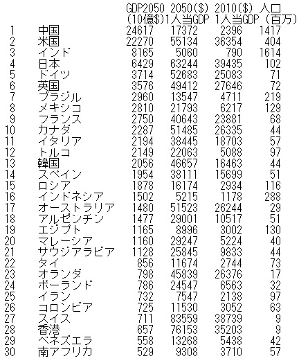 2050年の世界経済規模ランキング30位まで一覧表を引用します。2050年の予想GDP、2050年の1人当たりGDP、2010年の1人当たりGDP、2050人口と並んでいます。2000年の米ドル価値で表されています。