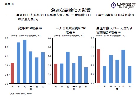 日銀の白川総裁が新年の講演「デレバレッジと経済成長――先進国は日本が過去に歩んだ「長く曲がりくねった道」を辿っていくのか?――」でこれに呼応する趣旨の発言をしています。《次に「失われた20年間」の後半期であるが、この時期については、人口動態の変化、より具体的には急速な高齢化の影響が大きい。日本の実質GDP成長率は確かに低下し、他の主要国と比較しても見劣りするが、過去10年の平均でみると、人口一人当たりの実質GDP成長率は他の先進国とほぼ同程度、そして、生産年齢人口一人当たりの実質GDP成長率で比較すると、日本が最も高い》。説明するグラフを以下に引用します。