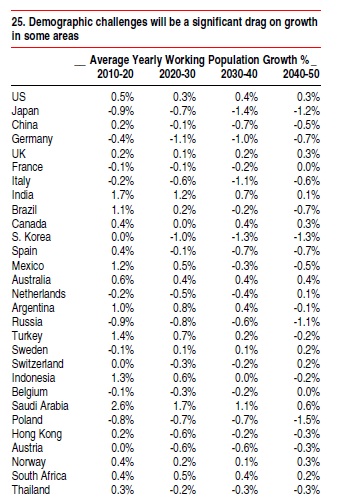 HSBC予測も日本の人口がかなり減っていくことを前提にしながら、1人当たりGDPが伸びて経済規模を維持していくと見ています。教育の機会均等や民主的な政治体制、法治能力も経済成長に影響するとされています。経済成長を考える上で人口の動向は支配的要因ですから、増減表を一部引用します。先進国でも米英加豪は増え続け、日独伊はかなり減っていきます。中国とブラジルは途中で減少に転じますが、インド、インドネシア、サウジアラビアあたりは増え続けます。中国の人口ボーナス期は終わりかけていますが、インドはこれから人口ボーナス期に入るところです。