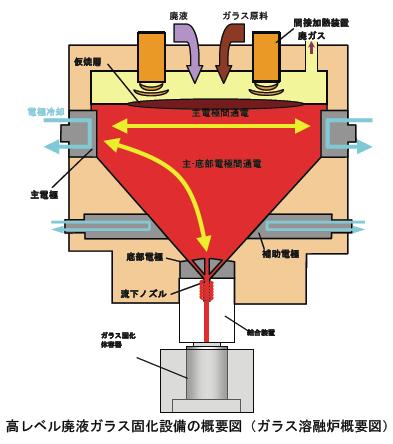 完成が15年も遅れている青森・六ケ所核燃料再処理工場が試運転を再開したのに、事実上、完成不能の窮地に陥りました。最終ガラス固化工程で溶融ガラスが流下しない初歩的トラブルに対処する方法が無くなっているのです。2兆円以上も掛けた再処理工場が完成せず、国策である核燃料サイクル全体が死に体になってしまいました。溶融炉の構造は以下のようです。