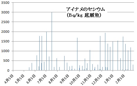 アイナメのセシウム含有量は秋口に一時的に下がったものの、秋から年を越えて1キロ当たり1000ベクレル以上の高い水準を保っています。放射性物質の海への流出が止まれば、セシウムは魚の体内から代謝されて減って行かねばなりません。高汚染の魚が揚がり続けている以上、新たなセシウムを魚が摂取していると考えるしかありません。