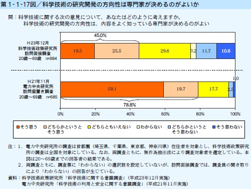 《震災前は「科学技術の研究開発の方向性は、内容をよく知っている専門家が決めるのがよい」との意見について、「そう思う」と回答した者が59.1%であったのに対して、震災後は19.5%へと1/3程度にまで激減している。「どちらかというとそう思う」を含む肯定的回答の割合を見ても、震災前は78.8%であったのに対して、震災後は45.0%へと大幅に低下している》