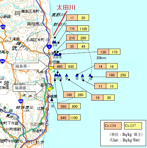 上の地図に追加記入したように、太田川は原発20キロ圏ぎりぎりで太平洋に注いでいます。原資料は東電が3月30日に発表した「福島第一原子力発電所 20km 圏内海底土中放射性物質濃度(セシウム)移行調査結果図」で、原発近くに目が行って太田川周辺まではよく調べられていません。