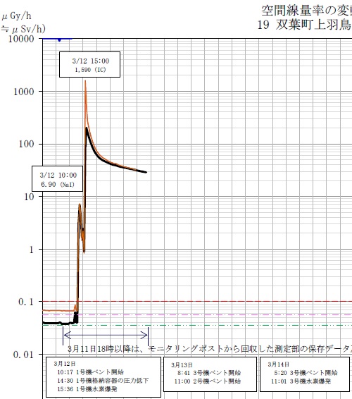 格納容器の圧力を下げる大規模な蒸気排出「ベント」が1号機で午後2時半ごろに実施され、流出した放射能の雲が襲来した結果です。午前10時にも毎時6.9マイクロシーベルトのピークがあり、こちらは中途半端なベントで失敗した時刻と一致しました。