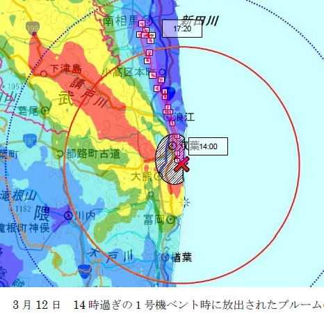 午後2時半ごろ実施のベントで雲はどう流れたのか、上の地図を見てください。東電が「福島第一原子力発電所事故における放射性物質の大気中への放出量の推定について」で公表しています。双葉町役場の東側を北へ流れ、浪江町を経て午後5時過ぎには南相馬市役所付近に達しました。上羽鳥モニタリングポストは双葉町役場から西に1キロ以上離れています。放射能の雲は真上を通っておらず、雲の直下はさらに高線量だったはずです。ベントでの放出量は希ガス3000兆ベクレル、ヨウ素131が500兆ベクレル、セシウム134が10兆ベクレル、セシウム137が8兆ベクレルという膨大なものでした。