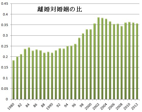 人口動態の2012年推計が発表されて東日本大震災で生まれた離婚率の特異な減少が2年連続で維持されました。最近の推移を離婚対婚姻の比グラフでみると、夫婦3組に1組は離婚する時代が定着したとも言えます。米国では2組に1組の離婚がずっと続いていますから、日本の離婚はやがて米国並みに増えるとの予測は当たらなかったことになります。しかし、1980年代では5組に1組の離婚だったのですから離婚夫婦が珍しくなくなったのは当然です。