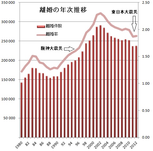 昨年の「離婚率が特異な減少、震災で家庭防衛意識か」の際には1995年の阪神淡路大震災と比べていませんでしたから、上のグラフを作ってみました。東日本大震災の影響を知ってから見ると、1990年から急増していた離婚率が1995〜96年と鈍り、踊り場状態になっていたと知れます。大津波や福島原発事故による家族崩壊の危機はありませんでしたから、阪神大震災が離婚に及ぼした影響は限られていたのでしょう。