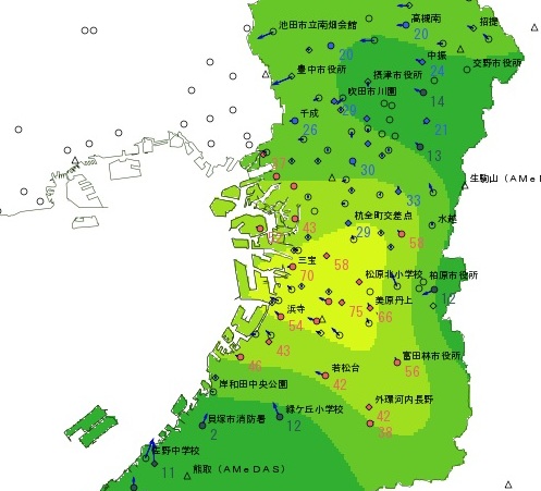 観測地点が多い大阪で2月1日午後7時の状況をマップにしたものです。この時間の最高値は75マイクログラムです。「大阪府 大気汚染常時監視のページ」でデータを得ています。この日は府内39地点の内、6地点で1日平均が35マイクログラムを超えました。マップの中央、黄色の部分とほぼ重なります。周辺の一段濃い部分は1日平均が30マイクログラム前後に相当します。大阪市南部に堺市、富田林市などを含む地域です。