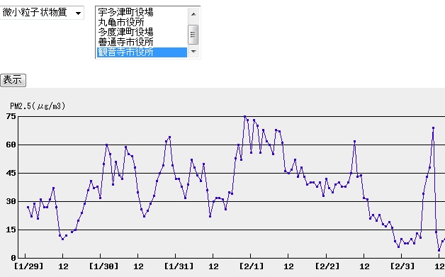「讃岐の空情報館」の「経時変化グラフ」で、観音寺市での測定値グラフを出しました。最高値は75マイクログラムにもなり、確かに1月30日からの3日間は大幅な超過があります。1日だけで済まなかった点は重症です。
