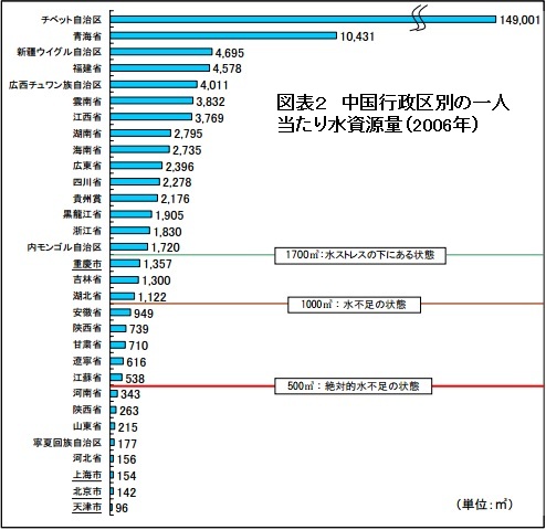 水資源について調べてみると、大和総研から「中国における水環境問題〜深刻化する水質汚染問題の現状と中央政府の施策」がリリースされています。そこから「図表2 中国行政区別の一人当たり水資源量(2006年)」を以下に引用します。