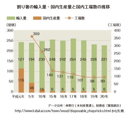 「木づかい.com」のウェブ《日本の森林を育てる「国産材割り箸」》から「割り箸の輸入量・国内生産量と国内工場数の推移」グラフを引用しました。日本国内の割り箸生産は21世紀に入って縮小してしまい、中国からの輸入が大半になりました。日本国内で造る6億膳ほどは《本来は捨てられる住宅・家具等の端材(=はざい:必要な部分を切り取ったときにできる余った木片など)や間伐材を有効活用して作られるため、国産の割り箸と「森林破壊」や「はげ山」などの問題とは次元が違います》と言えます。