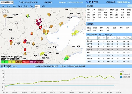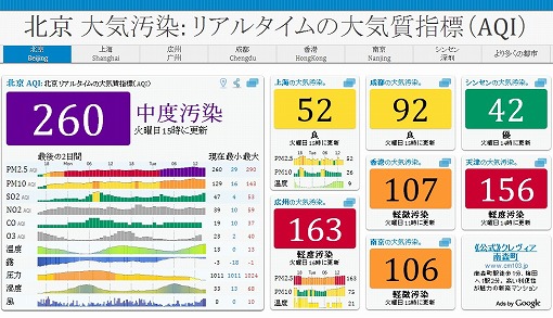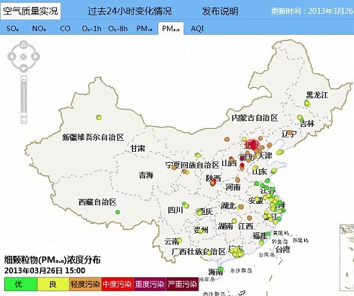 中山大学のチームが新たに作った「全国都市大気実況」は、二酸化硫黄や二酸化窒素、PM10などの指標も含む総合表示板です。同じ26日15時時点で中国全土のPM2.5状況は以下のメイン地図に表されます。北京から内陸部が悪化、上海や南部は良好です。