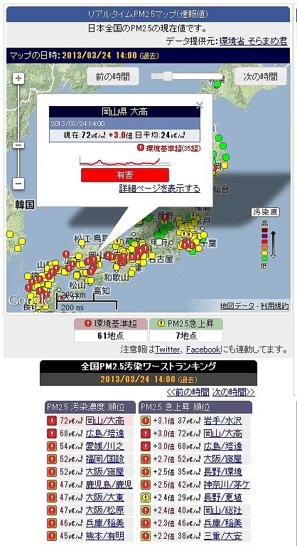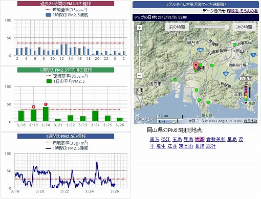 日本のサイト「日本全国の大気汚染粒子PM2.5情報まとめ」は公的機関ではなく、様々な便利サイトを開発している「satoru.net」が作っています。環境省の「そらまめ君」からのデータを加工しています。従来はブロック別の実況しか分かりませんでした。過去に遡れる機能があるので、上の地図は全国各地で国環境基準を上回った3月24日14時を表示しています。この時点でPM2.5濃度が空気1立方メートル当たり72マイクログラム(国基準は35)と最高だった「岡山・大高」を、ランキングからクリックすると次のように表示されます。(なお、このサイトはブラウザを選び、インターネットエクスプローラは相性が悪く、グーグルクロームをススメます)