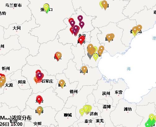第348回「抜本策無しと露呈するばかりの中国環境汚染」で全国人民代表大会・全国政治協商会議の動きを集めていて、北京市当局の鈍感さには驚きました。2008年北京五輪で青空が実現した成功体験にまだ浸っていました。五輪期間中だけ工場・建設現場を止め、クルマの半数を使用停止にして乗り切ったのが実情です。全人代が閉会して10日余り、過去の成功体験では民衆を抑えられないと方向転換したと見えます。しかし、下に引用するPM2.5濃度分布地図(第350回「PM2.5汚染の全国実況表示が日中で動き出した」参照)が示すように、紫や赤表示の北京の大気汚染は内陸部と繋がっています。北京市だけで改善できるものではありません。