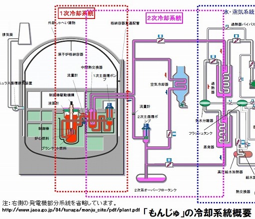 原子力研究開発機構の《「もんじゅ」のプラント情報》から引用した冷却系統図です。通常の原発と違い、高温の液体ナトリウムが冷却材として流れています。液体ナトリウムは漏れれば大気やコンクリート中の水と猛烈に反応して燃え上がります。事実上、唯一の安全設備として備える中央の「空気冷却器」は核分裂停止後の崩壊熱を大気中に放出する役割ですが、実際には機能が実証されていません。この2次系設備を使う以前の問題として、1次系が破綻したら冷やす手段などありません。炉心溶融して原子炉の底が破れる想定をしたらおしまいです。漏れだす液体ナトリウムがコンクリートに触れればまず燃えます。もちろん水をかけることはタブーです。ナトリウム受けに格納容器の底を鋼板で覆う対策をとっても、原子炉の底を溶かして落ちてくる溶融炉心まで受け止められるはずがありません。