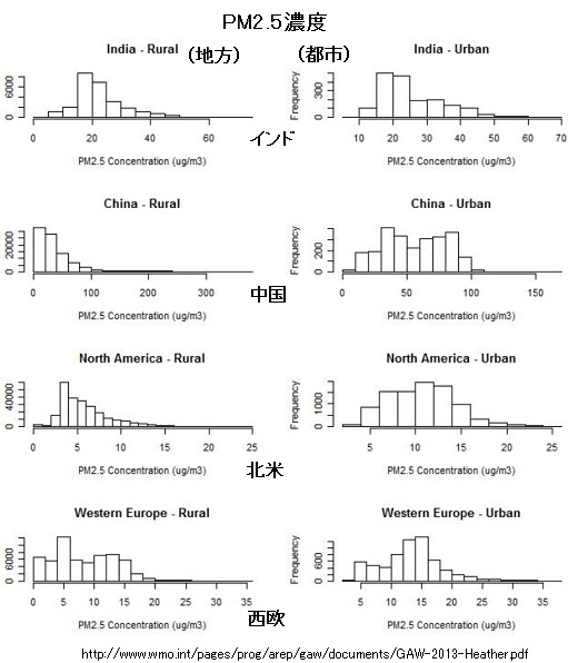 世界気象機関(WMO)が3月にスイスで開いたシンポジウム「WMO’s Global Atmosphere Watch Symposium〜Air Quality & Health」は、2010年には大気微粒子汚染で330万人の死者、家庭空気汚染で270万人の死者と指摘します。2005年段階でPM2.5濃度をインド、中国、北米、西欧の都市・地方で評価した上のグラフが注目です。2008北京五輪より前の時期ながら、インドの都市部は中国に近づいていますし、中国の地方部でも欧米の都市部を超える濃度になりつつあります。今年初めの深刻な事態は積み上げられた結果であり、たまたま起きた事態ではありません。