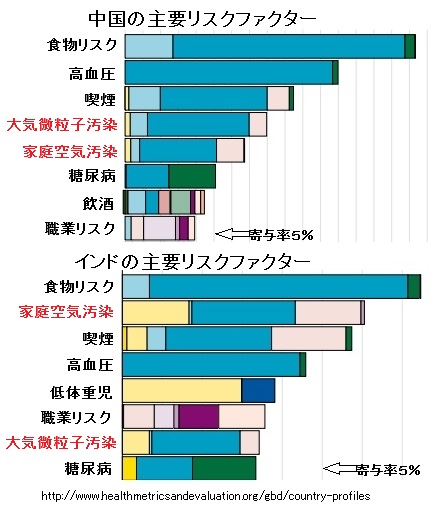 4月上旬に大気汚染が深刻な中国で2010年の死因の約15%は微粒子PM2.5によるとの報道がありました。元になる研究結果が最近、国別に公表され、インドがまさに中国の状態に突き進みつつあると判明しました。微粒子大気汚染と言えば年始めの北京の重篤スモッグが連想されますが、家事で使う固形燃料などから出る煙も仲間であり、重大深刻な汚染源です。大気汚染の何割かは家庭空気汚染が漏れ出たと考えられています。各国が参加した世界疾病負荷研究(Global Disease Burden GBD2010)の国別プロフィールから、中国とインドで健康に影響している主要リスクファクターのグラフを以下に抜き出しました。