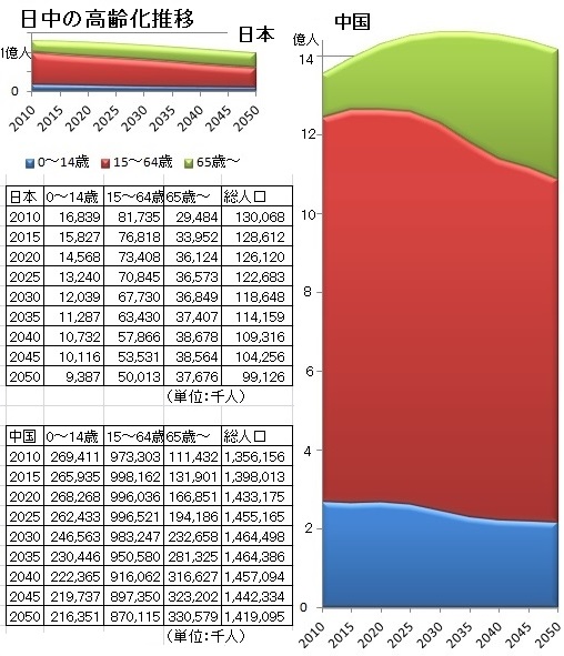 人口が日本の10倍もある中国の老齢化を論じる際、日中それぞれの国内比率だけではイメージが湧かない面があります。絶対的な人口ボリュームが見えるように日中の高齢化推移を同じ縮尺のグラフにしました。既に緑色の65歳以上人口だけで日本総人口を上回っている上に、世紀半ばにかけて3億人を超す膨大な数に膨らみます。また、このグラフからも読み取れるように中国の生産年齢人口(15〜64歳)は今がピークで、2011年から減少に転じています。(人口出典:日本、中国)