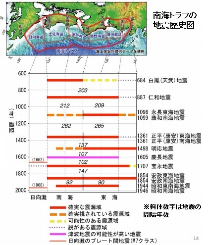 時事通信の《今後30年で60〜70%=南海トラフ巨大地震の確率−「切迫性高い」と政府調査委》が「従来は東海、東南海、南海のエリア別に評価してきたが、連動する可能性もあるため、南海トラフ沿いのどこかで巨大地震が起きる確率を公表した」「南海トラフ全域で地震が起きた場合、最大でM9.1と想定したが、過去に起きた証拠がなく、M9.1に限った確率は計算できなかった。ただ、大幅に低くなるという」と伝えた意味が、上の歴史図を前提にすると理解しやすくなります。当面はマグニチュード(M)8クラスの心配をし、超巨大地震も頭の隅には置いて欲しいのです。