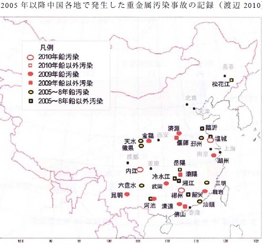 中国における汚染源は鉱山と精錬業が大きな部分を占めます。上の地図は2005年以降に発生した重金属汚染事故の記録です。「2006年度を断面に捉えると、各金属の排出量は鉛が約330トン、砒素250トン、六価クロム90トン、カドミウム50トン、水銀23トンである。ここではまず、汚染事故が最も多い鉛について、定量的な分析を試みることとする。統計によれば、2006年度の中国における排水中の鉛の総量は333.1トンであり、その内訳は60%以上が非鉄鉱業起因で、金属関係産業全体では約90%の排出量を占めているのが特徴である」「日本の鉛排出量は年間20トン程度であって、その50%近くが下水起因になっており、残りの大半が金属関係となっている。中国の場合、下水起因のデータが計上されていない状況で、全体の量が日本の約15倍にあたるので、今後下水起因の量が人口比で計上されるとすれば、鉛の排出量は更に大きなものになる可能性がある」