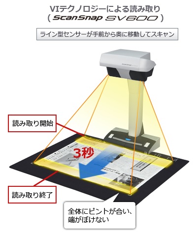 図のようにA3サイズでスキャンは3秒です。本の厚さは3センチまでです。東大生協に置かれたデモ機をリポートした《話題の非破壊型スキャナ、ScanSnap SV600に触れた》によると《台座部分にある「Scan」ボタンを押すと、ヘッドが動き対象物に光が照射されあっという間に見開き2ページ分のスキャンが終わった。次のページのスキャンができる状態になるまで約10秒待ち、ページをめくるとその直後にまたヘッドが動きスキャンされた》とあります。200ページの新書なら見開きでスキャンして20分余り必要になります。もし指で本を押さえて写り込んだら、後から消せます。