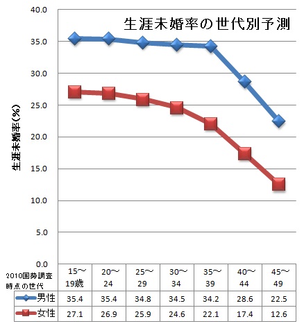 少子化社会対策白書のあまりの覇気の無さに驚き、国勢調査から生涯未婚率を予測し直して男35%、女27%にもなる結果を得ました。非正規雇用は増えるばかりで、若者の生活を不安定にさせている根源は政府施策です。『安倍政権が嫌いな雇用安定こそ少子化対策の核心』で指摘した通りです。生涯未婚率は人口学で50歳時点の未婚率と定められています。2010年国勢調査で20代前半だった世代が50歳に到達する25年後には、現在に倍する生涯未婚者であふれる事態になります。