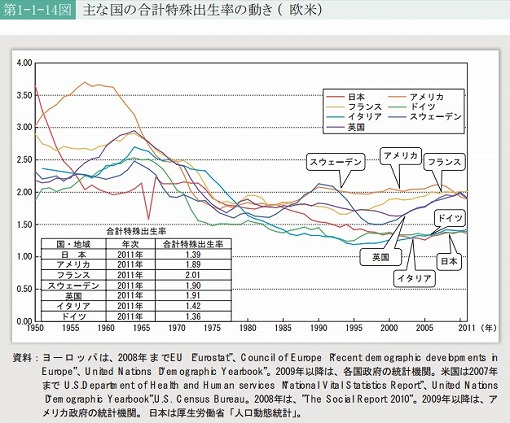 ここに添えられている合計特殊出生率の国際比較グラフも引用しました。人口維持に必要な出生率「2.1」に米英仏とスウェーデンが近づけているのに、2次大戦敗戦国の日独伊はそろって「1.4」前後と失格です。妙な自己責任主義では駄目です。人口を本当に維持したいなら、それなりに社会が面倒をみる、お金を掛けた強力な施策を打ち出すしかありません。女性手帳とか枝葉末節の議論をする暇があれば本筋の政策検討に移ってもらわねばなりません。