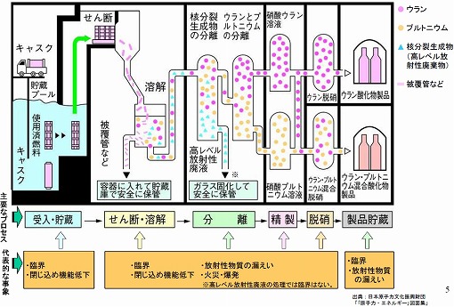 原子力規制委の資料「使用済燃料再処理施設の規制基準について」(2013/4/15)にある再処理主要プロセス図を掲げます。新骨子案で再三再四触れられているのが「重大事故に至るおそれのある事故」で《設計基準事故を超える事故(B―DBA)であって放射性物質の気相への大量移行(液体状の放射性物質が容器、管内又はセル内において、エアロゾル、ガス状等の外部に放出されやすい形態になること)を起こす事故》です。上図で臨界の危険があちこちで指摘されていますが、ここには無い「冷却機能の喪失による蒸発乾固」事故などが強く心配されています。