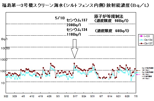 上のグラフは東電が公表している「発電所1〜4号機側取水口付近の海水」核種分析結果にある「7月5日取りまとめ分」から引用したものです。3号機から海に出た所にあるフェンス内側のセシウム137とセシウム134測定値が、原子炉等規制法に定める液体状の放射性廃棄物の濃度限度、リットル当たりセシウム137で90ベクレル(Bq)と、134で60Bqをしばしば超えていると知れます。5月18日のピークを調べるとセシウム137が230Bq/lと、134が110Bq/lと2倍にもなる数字です。
