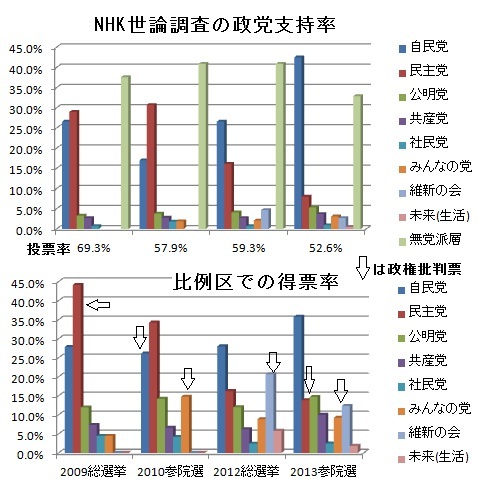 4回の国政選挙を見通すと、2009年には自民と民主の支持率差はわずかでしたから、政権交代は無党派層が民主に肩入れして実現しました。2010参院選で民主は少し議席を減らすも支持率並みの得票はしています。批判票は自民とみんなの党に向かっています。2012総選挙では批判票は維新の会などに大量に流れ込み、自民と民主は支持率相当の得票でした。民主大敗の理由はそもそも15%しかない支持率で解散に打って出たからです。これでは公明という下支えがある自公複合体にはかないません。もちろん支持率を下げたのは政権運営の失敗によります。