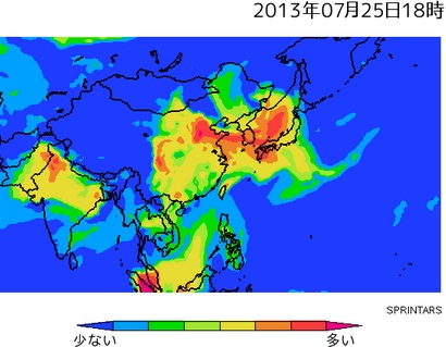 日本付近のこれほどのPM2.5汚染は珍しいので、該当する「SPRINTARS」の予測地図を引用しておきます。中国からの汚染繋がりがよく分かります。
