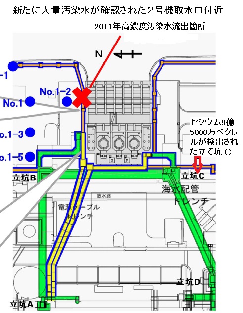 福島原発で新たに高濃度の大量汚染水が確認されました。最も驚く点は発電所構内で放射能汚染レベルを確認していない場所が存在する管理の愚劣さです。汚染マップが出来ていないのでは海洋流出防止は全く不可能です。1日には護岸近くで地中の遮水壁工事1列目が完成と伝えられました。水ガラスを地下2メートルから16メートルの深さまで注入した構造では、新たに見つかった汚染水には対応できない恐れがあります。国際的に非難される海への放射能流出は完全に止めねばなりません。政府の権限で強力な司令塔を現地に入れて、指揮を取らせるべきです。2号機取水口付近の地図を原子力規制委の資料から引用します。