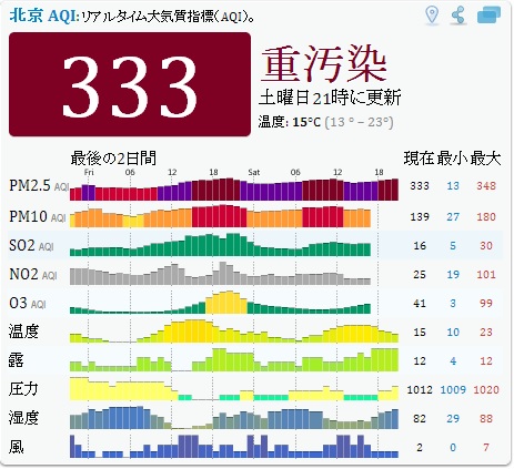 北京でまたも最悪の大気汚染が発生。実はニュースにされなかっただけで重篤なスモッグは夏場も頻発していました。5年で改善との計画は打ち出されましたが、事態の深刻さにきちんと向き合っていないと指摘します。端的な例を挙げると、人民日報電子版で北京の天気欄は「今日は天高く空気爽快」といった調子の記事ばかりです。よく見るとところどころ数日に渡り記事がありません。その期間こそスモッグが発生していたのです。スモッグは日本の研究チームによれば的確に予測できるのですから、天気欄記事は市民にスモッグ対策するよう注意を喚起する役割を果たすべきなのに、文字通り臭いものに蓋をして平然としています。北京の米国大使館が測定した今回のスモッグデータを引用しておきます。