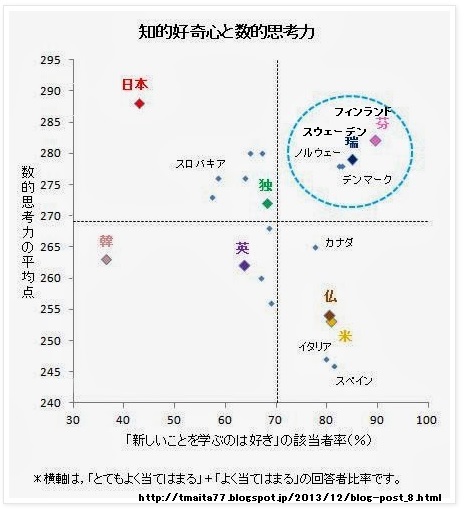 好奇心についての設問は最初の背景調査の項目です。背景調査の後、パソコンで回答できるグループは「読解力」と「数的思考力」に「ITを活用した問題解決能力」を答え、パソコンが出来ないグループは紙で読解力と数的思考力だけに答えています。グラフにある数的思考力の点数は両グループを合算した結果です。北欧三国にフィンランドは成績が良い上に知的好奇心も高い特徴があります。日本は成績は平均288点とトップですが、知的好奇心では下から2番目なので先進国全体から大きく外れた場所にいます。米国やフランスなどは好奇心旺盛なのに成績は下位、英独はどちらも平均的な位置につけています。