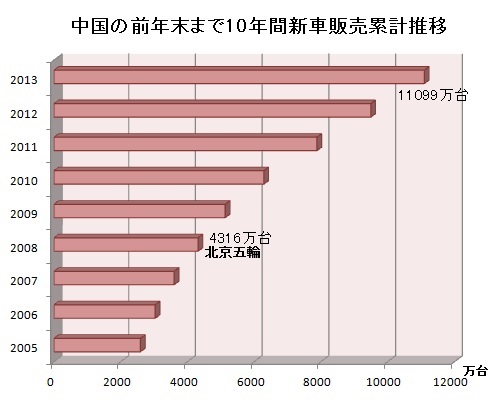 1月に始まった重篤スモッグ騒ぎ、師走になって中国政府もやっと大気汚染の底知れ無さを自覚したよう。国営新華社が異例の深刻ぶりを配信しました。小手先対応が無力なほど汚染源は経済発展に組み込まれています。同時に中国の新車販売が好調で今年2千万台を超えるニュースが駆け巡りました。クルマが主要汚染源であることは明らかなのに「3500万台も視野に入れる」と業界関係者がコメントする能天気に呆れます。グラフをお見せしましょう。中国で前年末まで過去10年間の新車販売累計がどう推移したか集計しました。北京市は北京五輪での青空回復を引き合いに出して「今回も乗りきれる」と主張しますが、2008年当時と比較にならない数のクルマが国内にひしめいているのです。