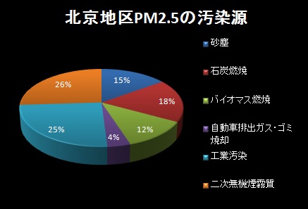 中国網の「北京のPM2.5 6つの主要汚染源が明らかに」は「北京のPM2.5には、砂塵(15%)、石炭燃焼(18%)、バイオマス燃焼(12%)、自動車排出ガス・ゴミ焼却(4%)、工業汚染・(25%)、二次無機煙霧質(26%)という、6つの重要な汚染源があることが明らかになった」と伝えています。2009年から2010年にかけて異なる季節に収集したサンプルを分析しています。2013年の資料ではありません。