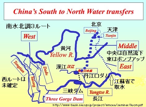 「水と空気と安全はタダ」と思っている日本と違い、中国ではどれも貴重な資源です。中国が経済成長を持続できるか、今年は長江水の北部転送事業による答えが出そう。既に大気汚染問題で赤信号が点きつつあります。南部の豊かな水を乾燥した北部で使う「南水北調」事業の1期分が昨年末に完工、今年から本格運用です。毛沢東が発想した巨大事業がついに出来たのですから国をあげてのお祝いになって良いはずが、控え目な扱いが不思議です。ひとつには水質汚染で飲用になる水を送れない恐れが高まっている点があり、地下水を汲み上げるよりも数十倍も高い単価になる水が広く使われるか、今後の維持費用も含めて疑問があります。まず完工した東と中央のルートを地図で見ましょう。